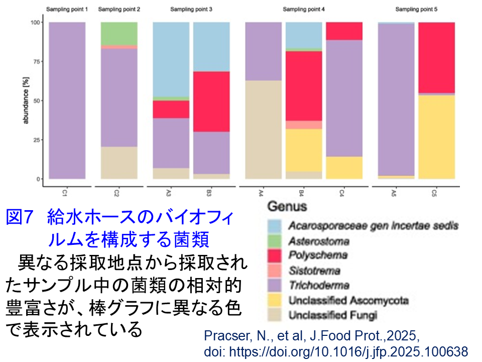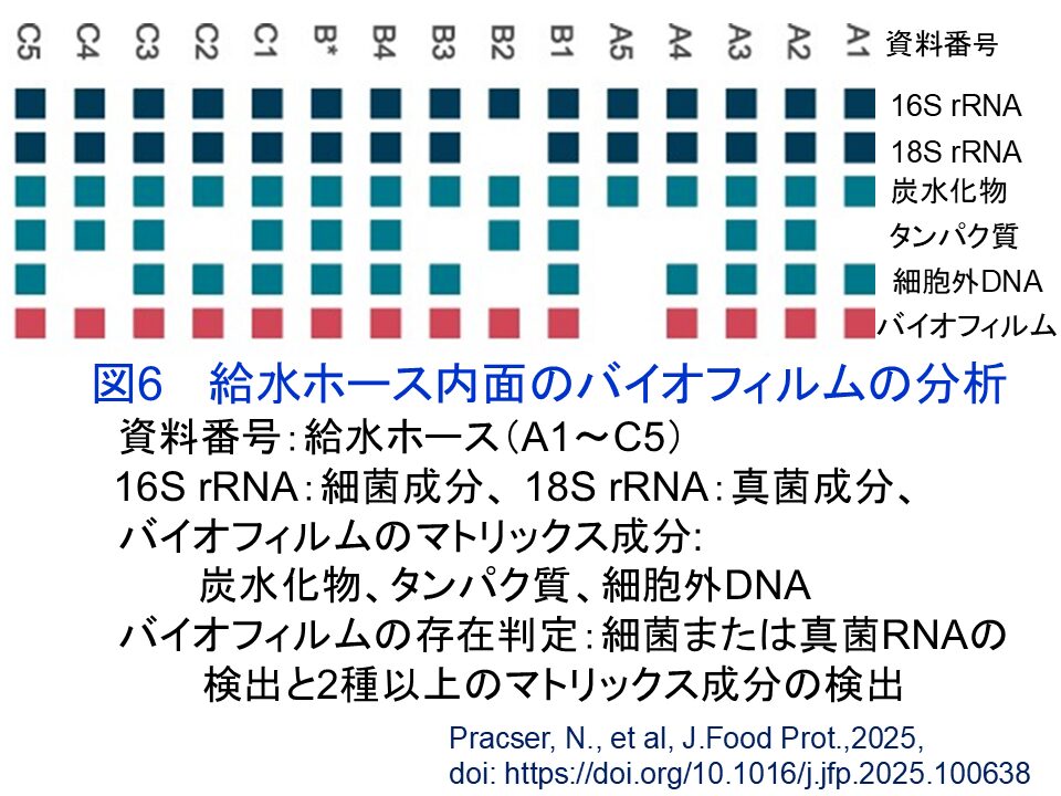 図2は、食品工場のホースの内面からバイオフィルムを光学的手法で検出された様子を示しています。図6は、給水ホース内面のバイオフィルムについて他の手法で検討を行った結果を示しています。細菌の存在は16S rRNA検査で、真菌の存在は18S rRNA検査で推定を行っています。バイオフィルムの存在は、そのマトリックス成分である炭水化物、タンパク質、ならびに細胞外DNAの分析も行なう確認が行われています。