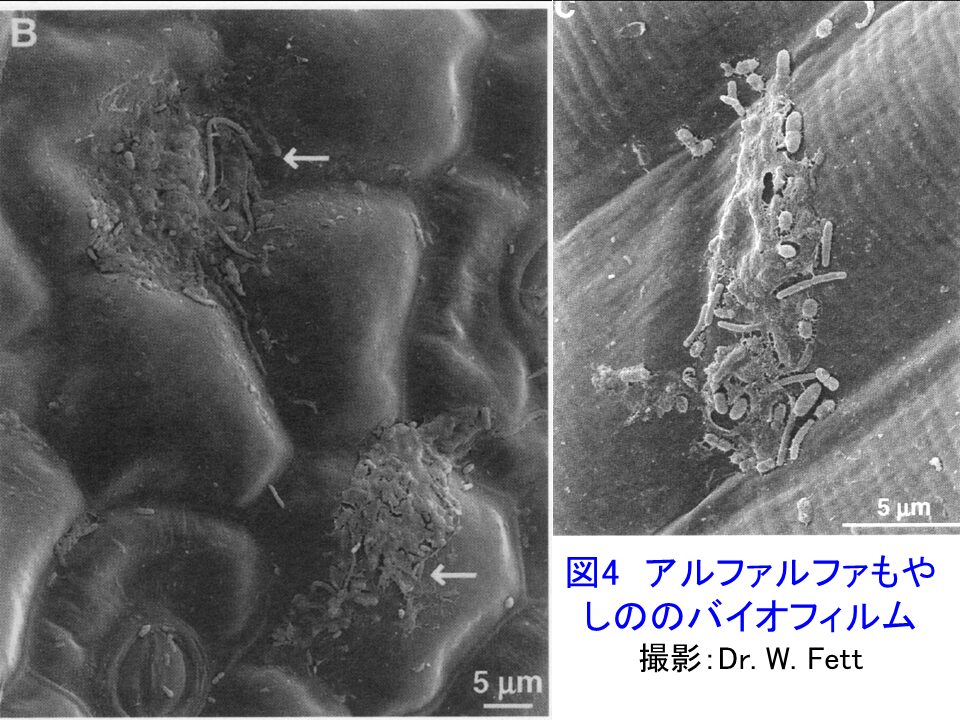 食品やその環境にも多くのバイオフィルムが存在します。図4は、生食されるアルファルファもやしで観察されたバイオフィルムの様子です。