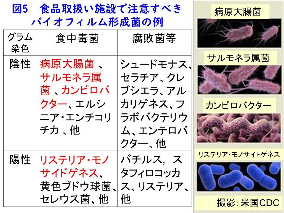 図5は、食中毒を起こしたり、食品の品質を低下させたりするバイオフィルムを作る細菌を示しています。病原大腸菌は、腸管出血性大腸菌を含むヒトに健康被害をもたらす大腸菌を意味しています。 フードチェーンには、バイオフィルムを作る微生物が広く分布しています。病原性を持つ微生物のバイオフィルムは、特に注意をしましょう。