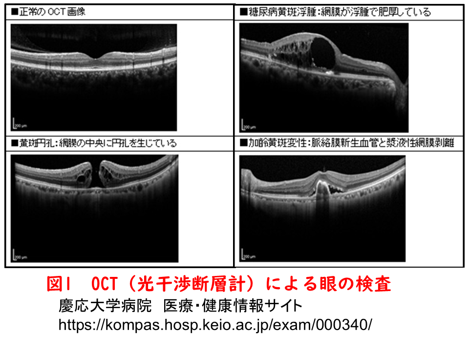 図1は、眼科で行われている眼底の光干渉断層計OCTの検査結果の写真です。近赤外線を利用して網膜の断面像を観察することができます。加齢黄斑変性、黄斑円孔や網膜浮腫などの網膜疾患の診断や術後評価に使われています。
