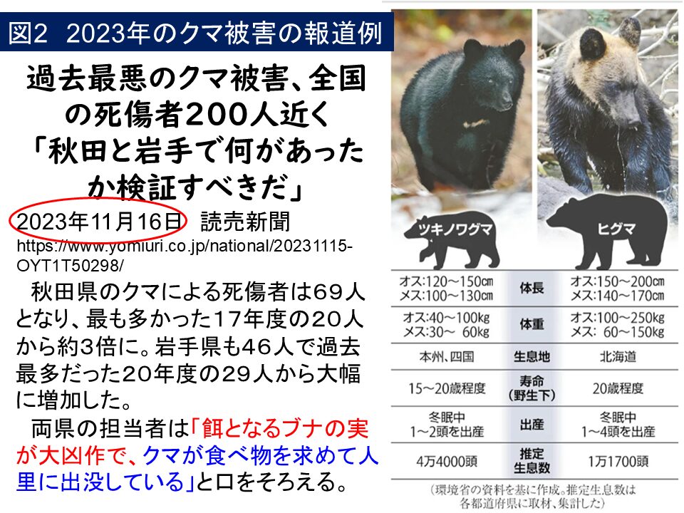 図2は、2年前の2023年11月16日の新聞報道です。クマによる被害が多く、特に秋田と岩手の被害が多いと報告されています。原因として、餌となるブナの実が大凶作であったことを秋田県と岩手県の担当者が指摘しています。