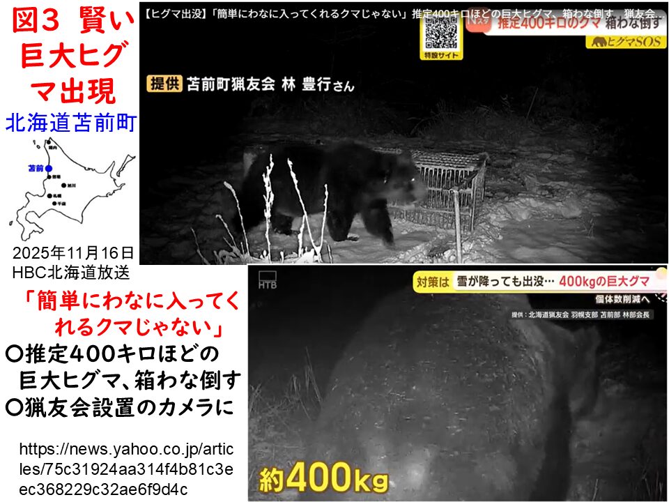 図3は、2025年11月に北海道苫前町で撮影された巨大ヒグマの映像です。図2では、ヒグマの体重は、オスでも250kgまでとされています。図3のヒグマは、映像から400㎏はあると推測されています。