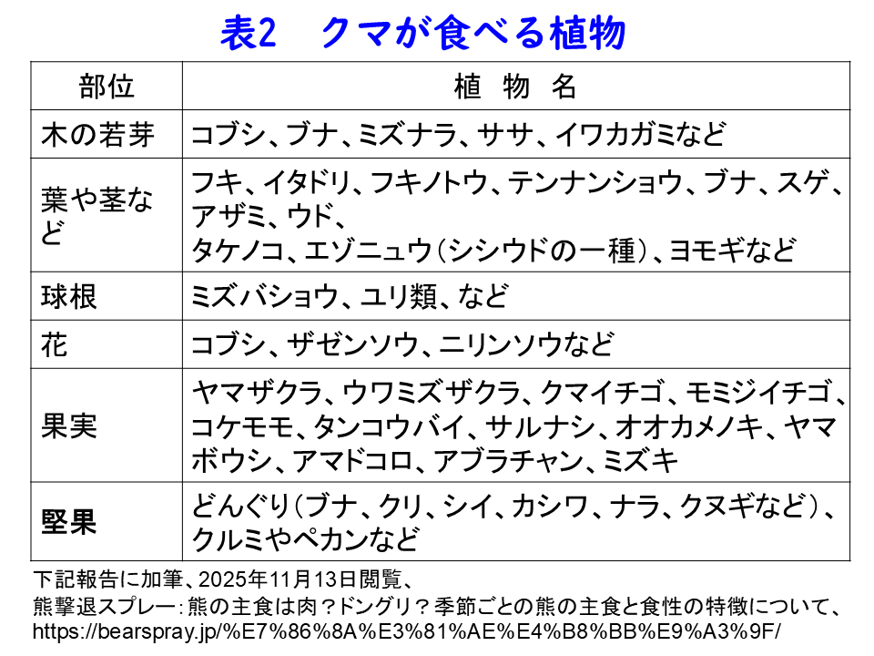 クマは、植物を主な餌として食べていますので、季節ごとに食べる植物の種類や部位が変化して行きます。クマが食べている植物は、表2に示しました。