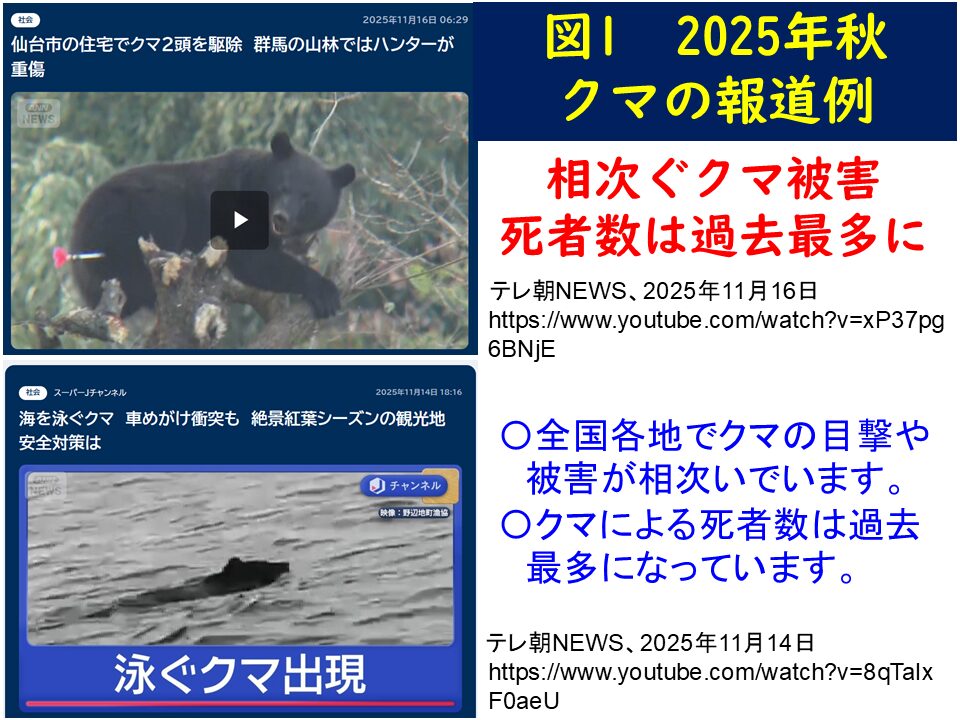 2025年のクマによる被害が、深刻化しています。 図1は、その報道例です。クマが住宅地に現れたり(上の画像)、海で泳いでいたり(下の画像)と、これまでにない現象も報告されています。
