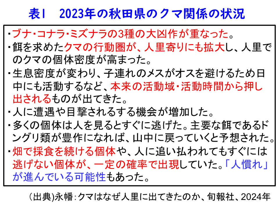 表1は、秋田県などのクマの観察を続けられている永幡嘉之さんが2024年10月に出版された「クマはなぜ人里に出てきたのか」から抜き書きしたものです。永幡さんも、木の実の大凶作がクマの行動に影響を及ぼしたと指摘されています。