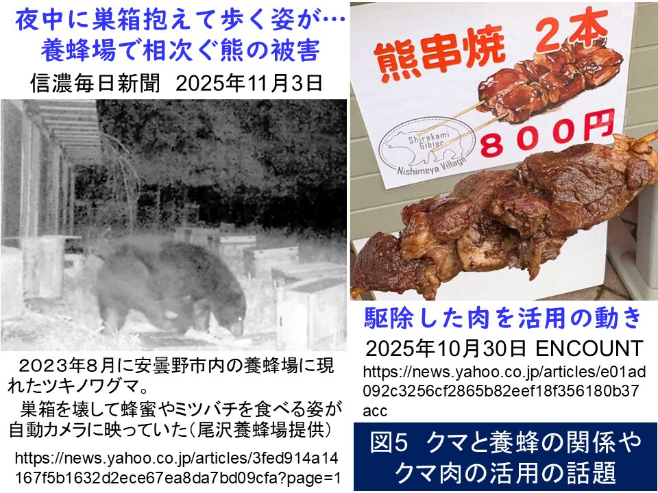 クマには、クマの都合があります。図5の左は、クマが夜陰に紛れてミツバチの巣箱を訪れた様子です。ヒトとクマのフードチェーンは重なっています。必要な時には、クマの命をいただくことはやむを得えません。食品衛生を大切にして、美味しくいただいてください。