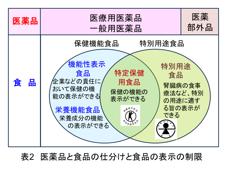 わが国の法的な食品と医薬品の取り扱いは、医薬品上位とされています。人の身体の構造または機能に影響を及ぼすものは医薬品と規定されています。食品の中で、この影響を与えることを表示しても良い食品群が例外として表2のように認められています。