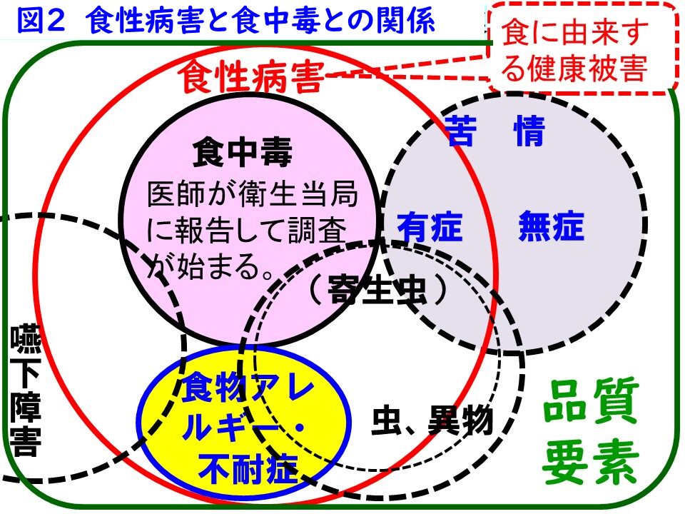 食品に起因する、あるいは食品が媒介する健康への悪影響は食中毒だけではありません。暴飲暴食や栄養失調は含みませんが、これらは食性病害と呼ばれています(図2)。食中毒統計に乗らない食性病害は、たくさんあります。
