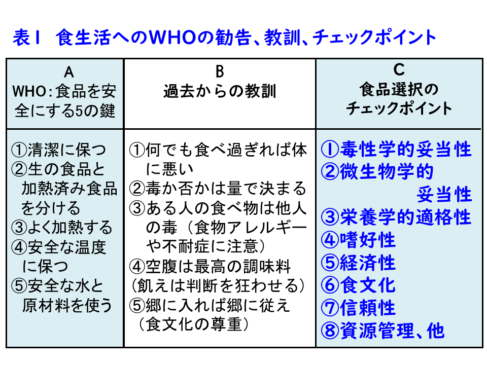 世界保健機関WHOは、表1のカラムAに示した「食品をより安全にするための5つの鍵」を2001年に発表しています。表1のカラムBには、過去から受け継いでいる、いくつかの教訓を示しました(第123話)。